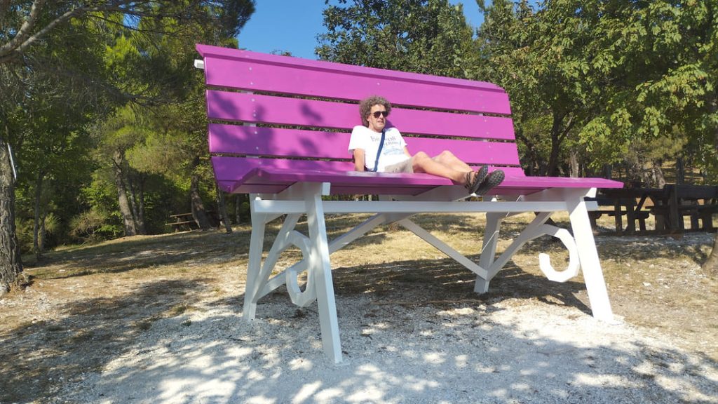 We slaagden er wel in, om nog kleine uitstapjes te doen zoals naar de Big Bench of reuzebank in Genga. Ooit bouwde een Amerikaanse designer zo’n bank in Piemonte, dat bleek zo’n succes te zijn dat er nu in heel Italie en daarbuiten gebouwd worden. Wil je weten of er bij jullie ook eetje staat ? Kijk dan eens op hun website.