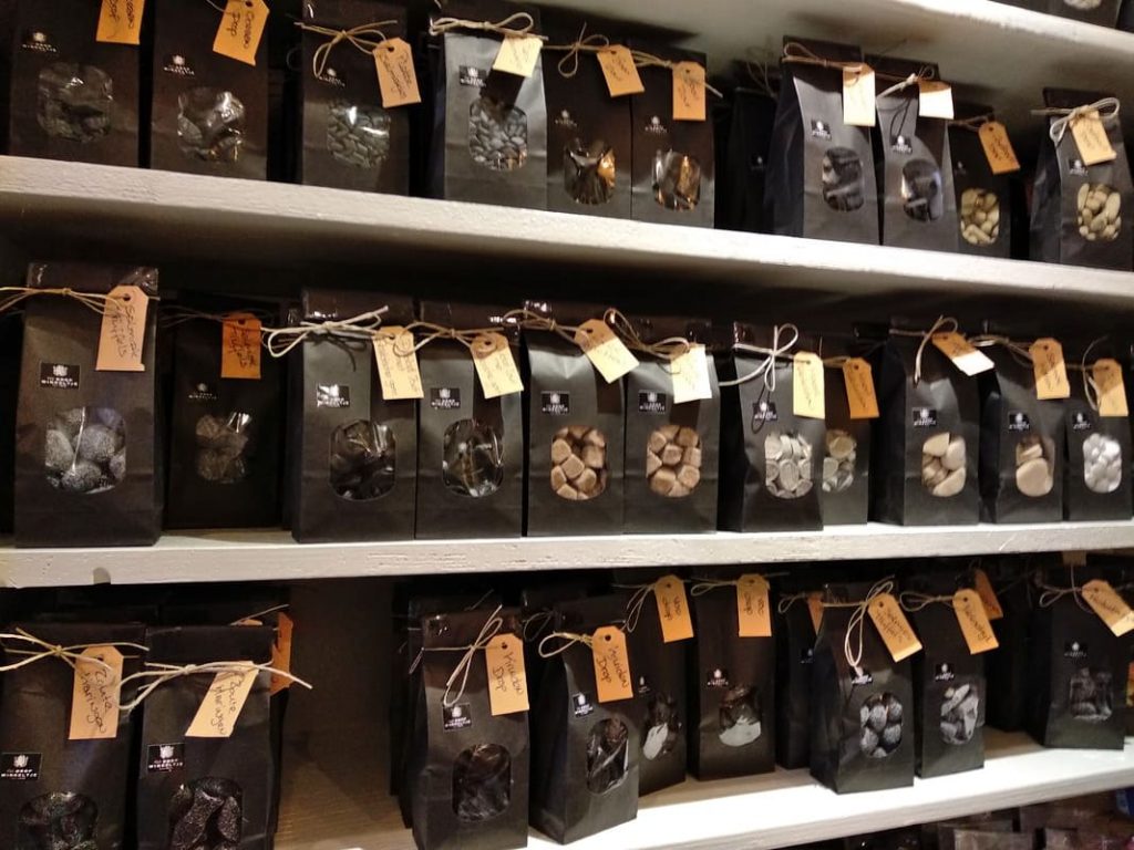 ’s Anderendaags geschiedde een wonder, het zonnetje kwam er warempel door. Wat hadden we het zonlicht gemist ! Voordat we onze familie in Vorden bereikten, stond een speciale ontmoeting op ons programma; een tijdje geleden trof ik een bijzonder dropwinkeltje aan op Facebook. Dit katapulteerde mij onmiddellijk naar mijn kindertijd; de Italiaanse nicht van mijn moeder beheerde ooit een echt ouderwets kruidenierswinkeltje in het Italiaans dorpje Ronco Biellese. Ze was zelfs onze buurvrouw, zodat we regelmatig daar belandden voor de boodschappen, maar vooral de grote glazen potten herinnerde ik mij nog heel duidelijk, vol met verschillende soorten snoep !!!