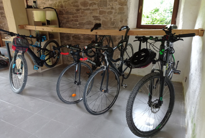 Qui puoi anche caricare la tua e-bike, c'è la possibilità di lavare le biciclette, sono possibili piccole riparazioni di biciclette e c'è anche un'opzione di asciugatura per i vestiti della bicicletta.